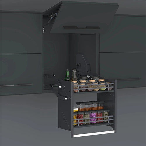 Desain dapur modern yang menampilkan lemari gantung dengan solusi akses inovatif