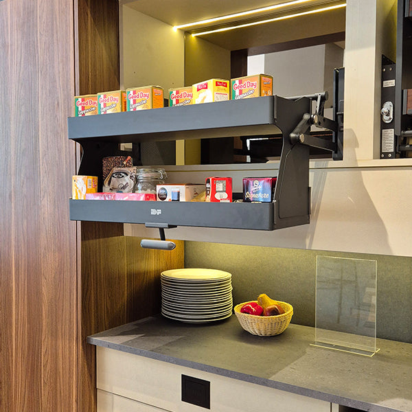 The IDF Compacta T-Pull Down is an innovative solution for hard-to-reach upper cabinets. With its double-layer system and smooth pull-down mechanism, you can easily access items stored in high cabinets without using a ladder or stool.
