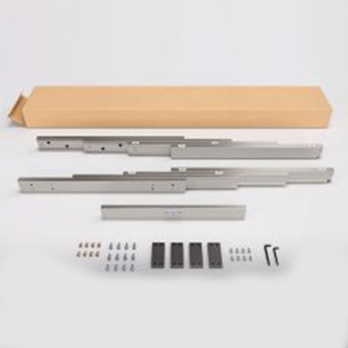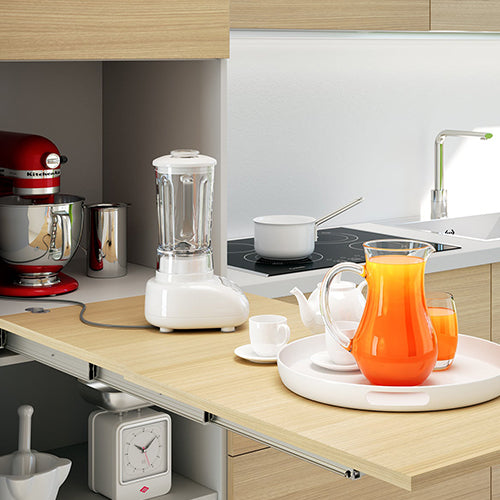Made of a robust and easy to handle aluminum guide system created by Atim, Homework allows you to store small appliances inside the kitchen cabinet and to use them on the extra support surface created by the hardware.