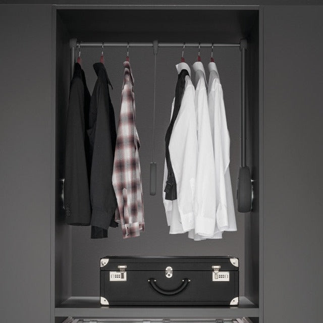 Up-and-down clothes hanger prepared for installation on the sides of the piece of furniture. Adjustable in width and supplied with shock absorbers that soften the up-and-down phase. Operating load 12 kg.